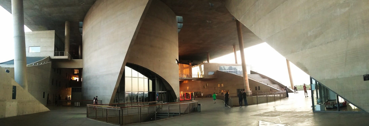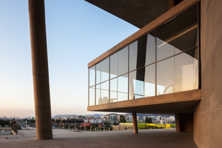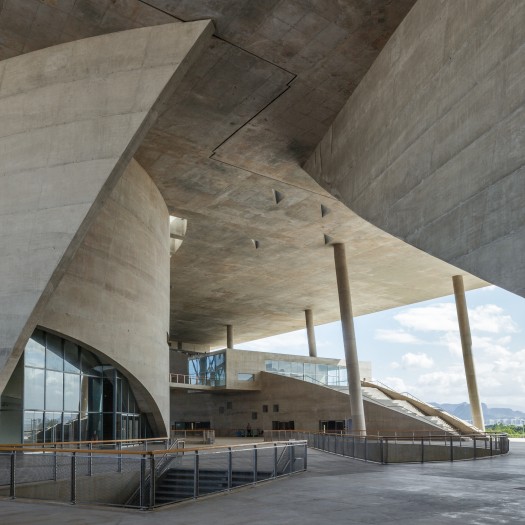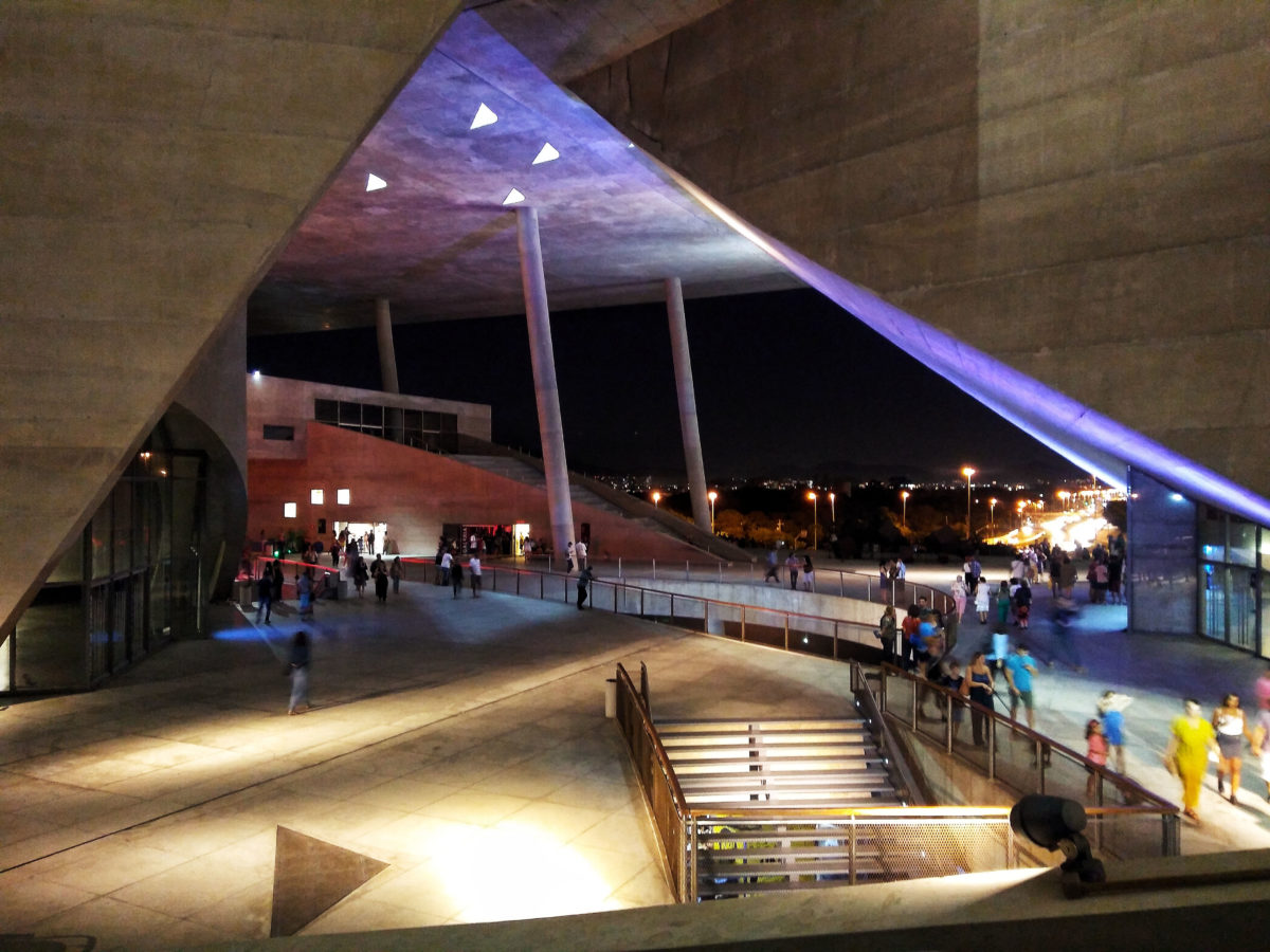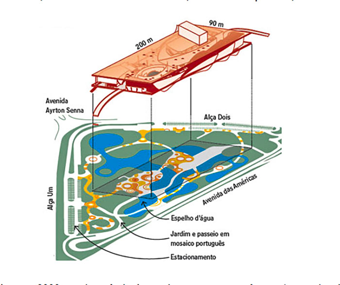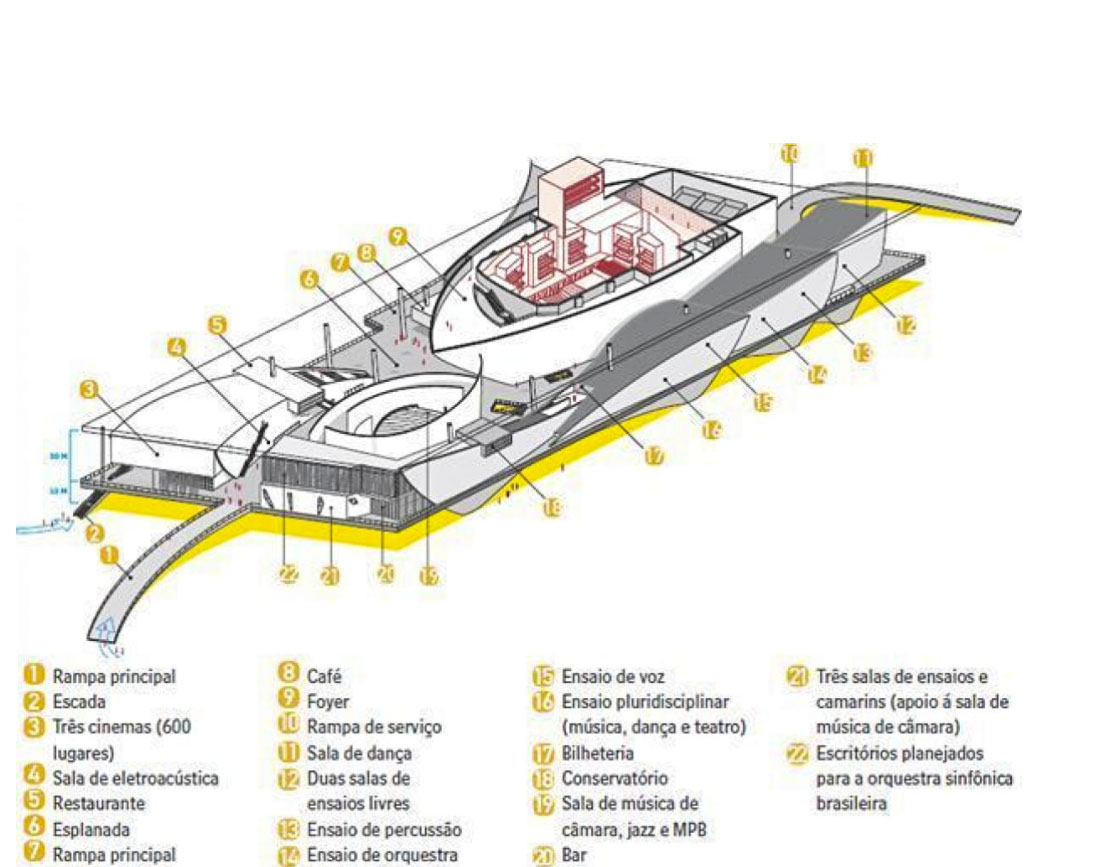 公共のランドマークとなるような建物を建設するにあたり、建築家はこの建物を地面から浮かせるように設計し、訪問者が広いテラスから、あるいは多くのインスタレーションから景観を鑑賞できるようにした。 クリスチャン・ド・ポルツァンパルクの コメント:「……リオの芸術の街の最初のモデル以来、さまざまな機能を独立したヴォリュームに配置し、音響的に隔離し、それらが “浮遊 “するように建てることが考えられてきた。