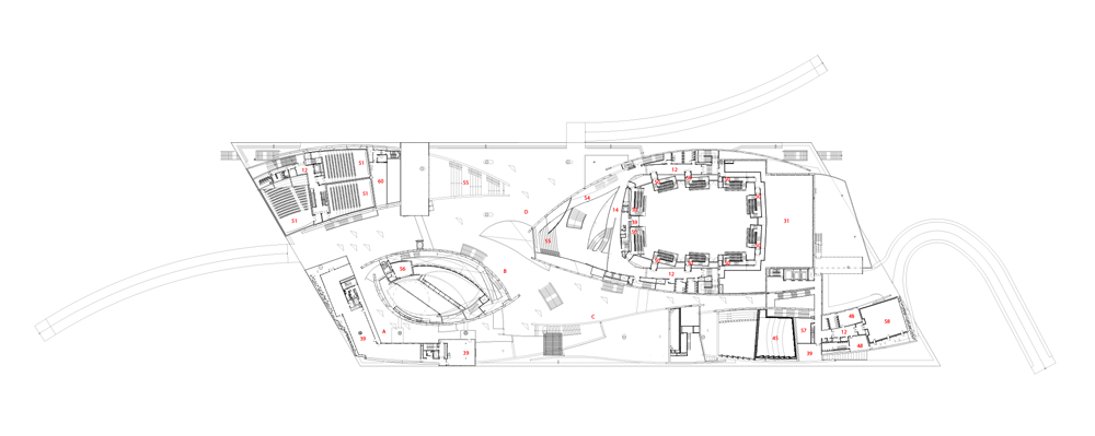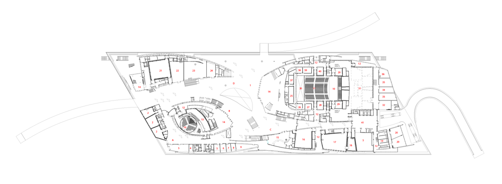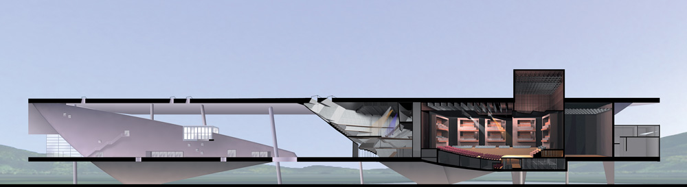 建物は、建設現場、地下、地下の屋根、エスプラナード、屋根を定義する4つのスラブで構成されている。 エスプラネードと屋根スラブは格子構造で、床と地下の屋根スラブは厚さ25センチの堅固なもので、中間層は従来の鉄筋コンクリートとプレストレスト・コンクリートのスラブと梁でできている。 2つの大きなスラブとむき出しのコンクリート壁が作品のフォルムを決めているからだ。