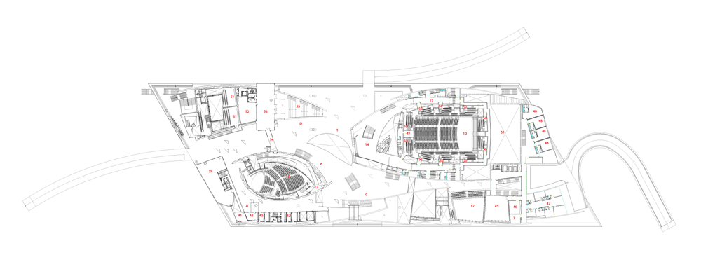 ホールを収容し、活動を分散させ、高さ30メートルの屋根で観客を迎えるエスプラネードは、透明ガラスでくり抜かれたブロックである。
