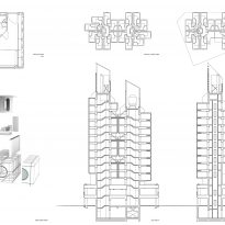 カプセルのライフサイクルが予想されることと、カプセルの用途が変わる可能性があることから、建物は構造軸、カプセル、設備の3つのエリアに分けられた。 各ユニットは、温水、冷水、排水管を含む6本のパイプに分割された亜鉛のフラットバーで構成されている。 各ユニットは3階建て。 また、リフトはプレハブ部品と3次元構造で作られているため、迅速かつ効率的に組み立てることができる。