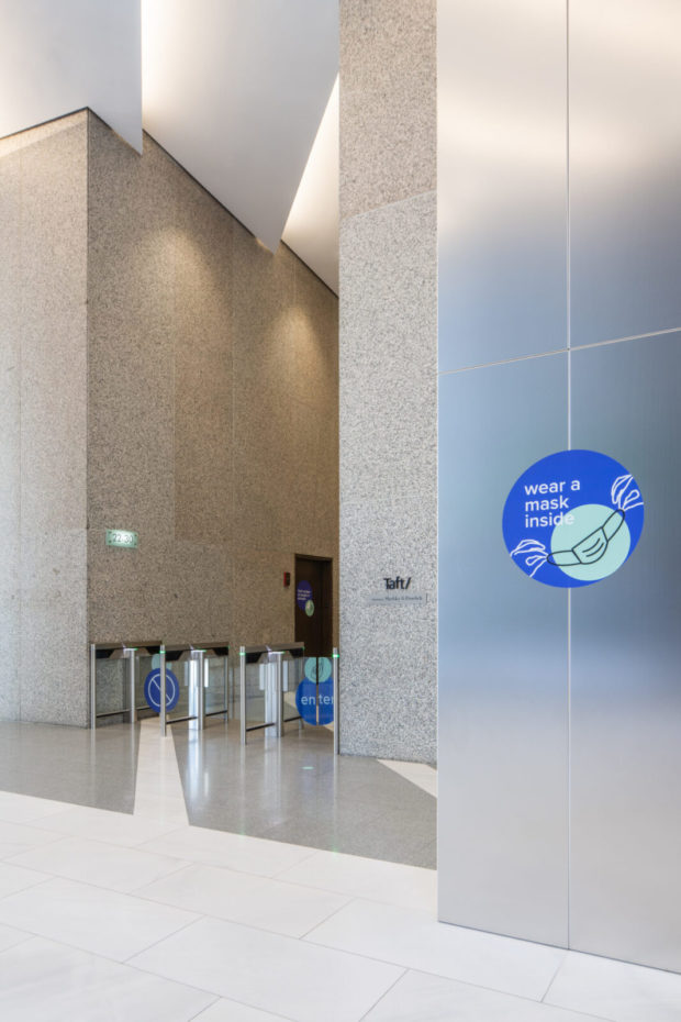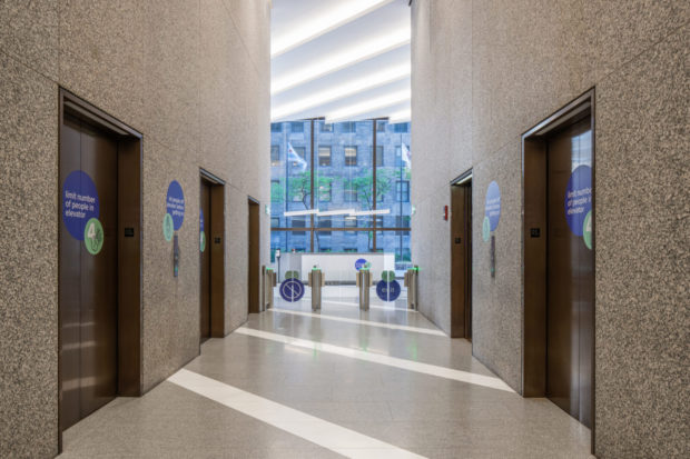 建物に入るには、テナントと訪問者は認定証を提示し、セキュリティ・チェックに合格しなければならない。