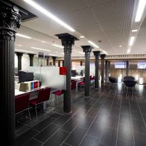 1階と2階は、公道からのアクセスにダブルハイトのスペースがあるため、細長い柱が一体のエリアを構成している。 柱 建物は灰色に塗られた鋳鉄製で、カレッジの事務的な手続きのほとんどがここで行われる。 このスペースのデザインは、他の部分と同じ言葉、同じ仕上げで行われているが、バックライトのついた大理石とガラスの壁、ブロンズ色の真鍮のプロファイルとパーツ、ガラスの手すり、竹材のスラットで構成された擬似天井を配置することで、より目立つようにしている。