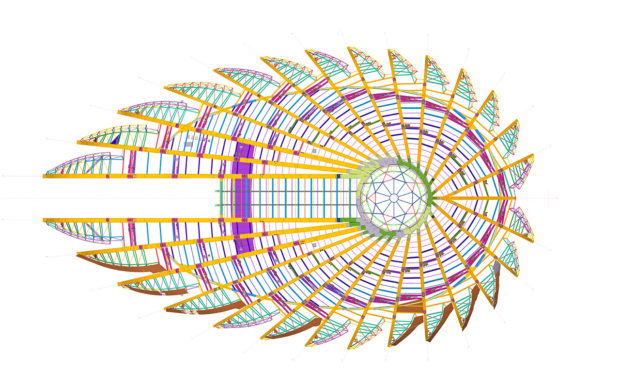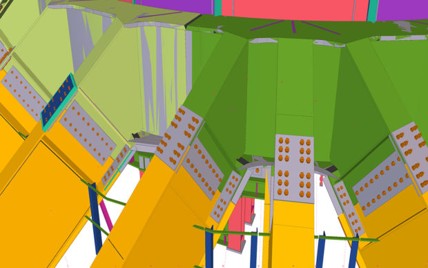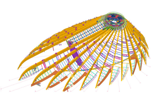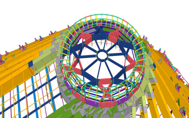 プロジェクトが複雑だったため、ほとんどの梁と接合部は特注品だった。 すべてのメイン・リブはキャンバー加工が施されている。 鉄骨構造の複雑さにおいて、BIM作業は大きな助けとなった。