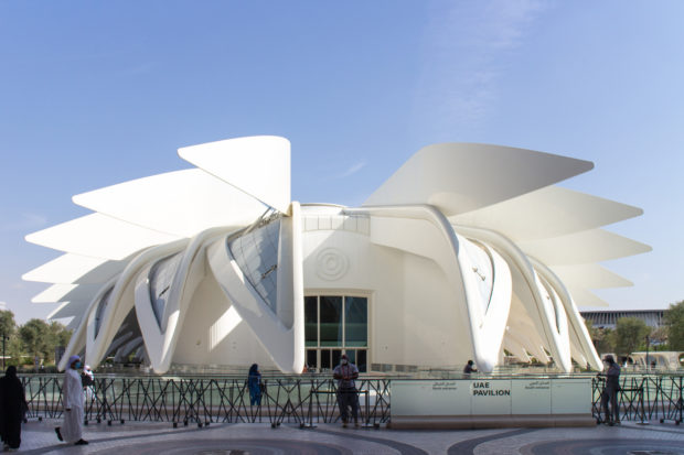 パビリオンの形状コンセプトは、首長国連邦の国鳥であるハヤブサの翼をモチーフにしたもので、開いているときは飛翔し、閉じているときは静止しており、首長国の人々のパイオニア精神の象徴としてデザインされた。 アラブ首長国連邦は、万博2020-2021のメインテーマである「心をつなぎ、未来を創造する」の具現化に注力した。