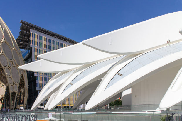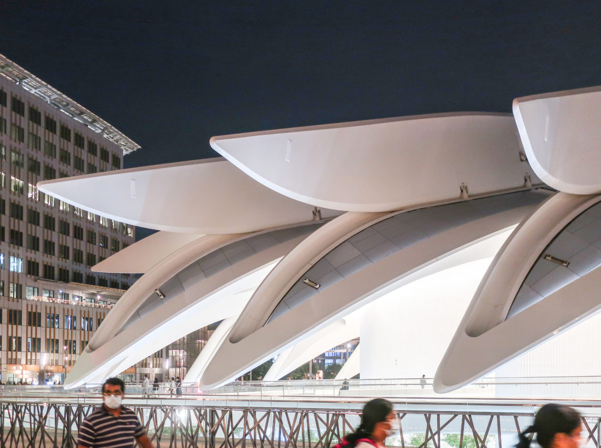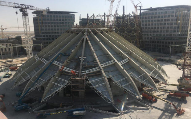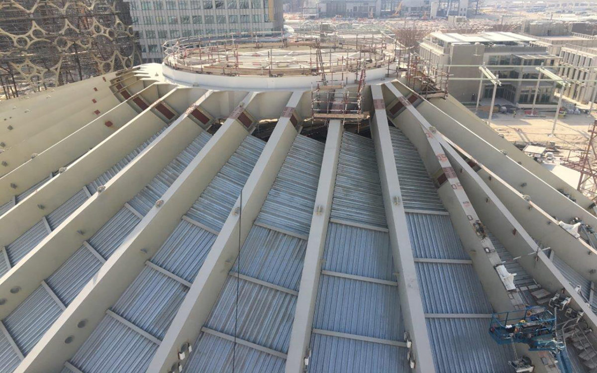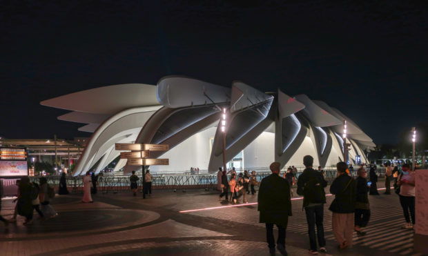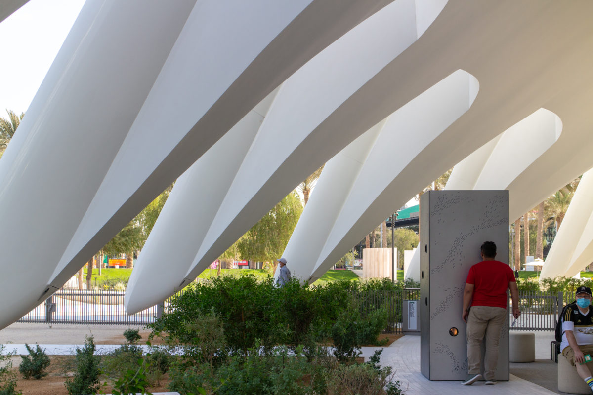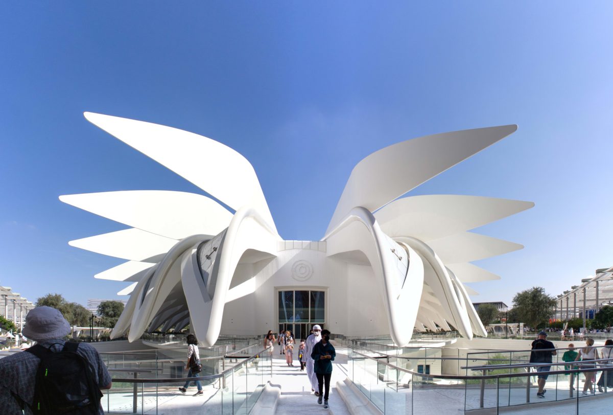 UAEのパイオニア精神と革新的精神を象徴するUAEパビリオンのスチール屋根は、ハヤブサの優雅さと強さに影響を受けた保護的なフォルムで、現代的な運動機能と革新的な建築要素を備えている。
