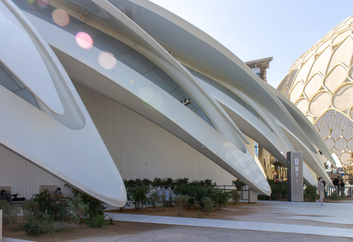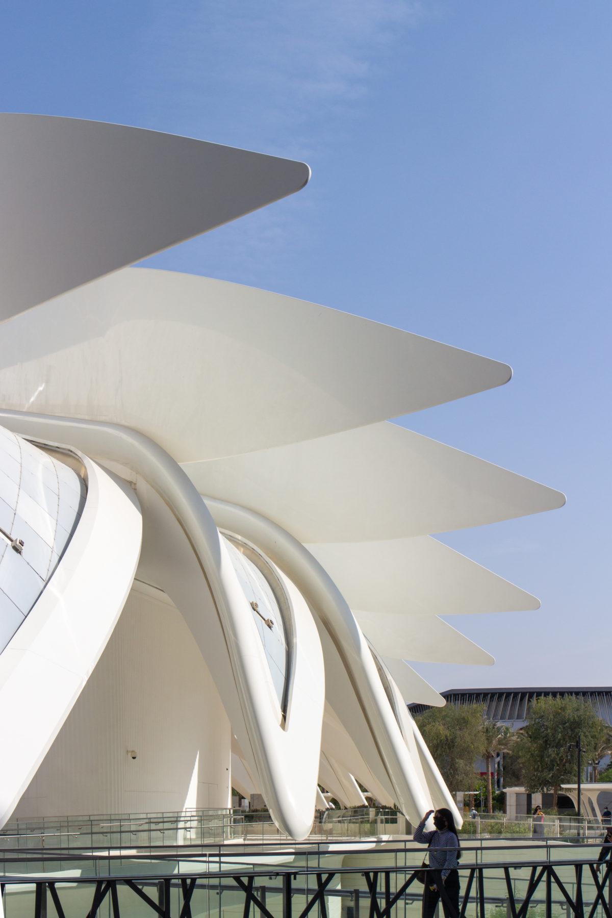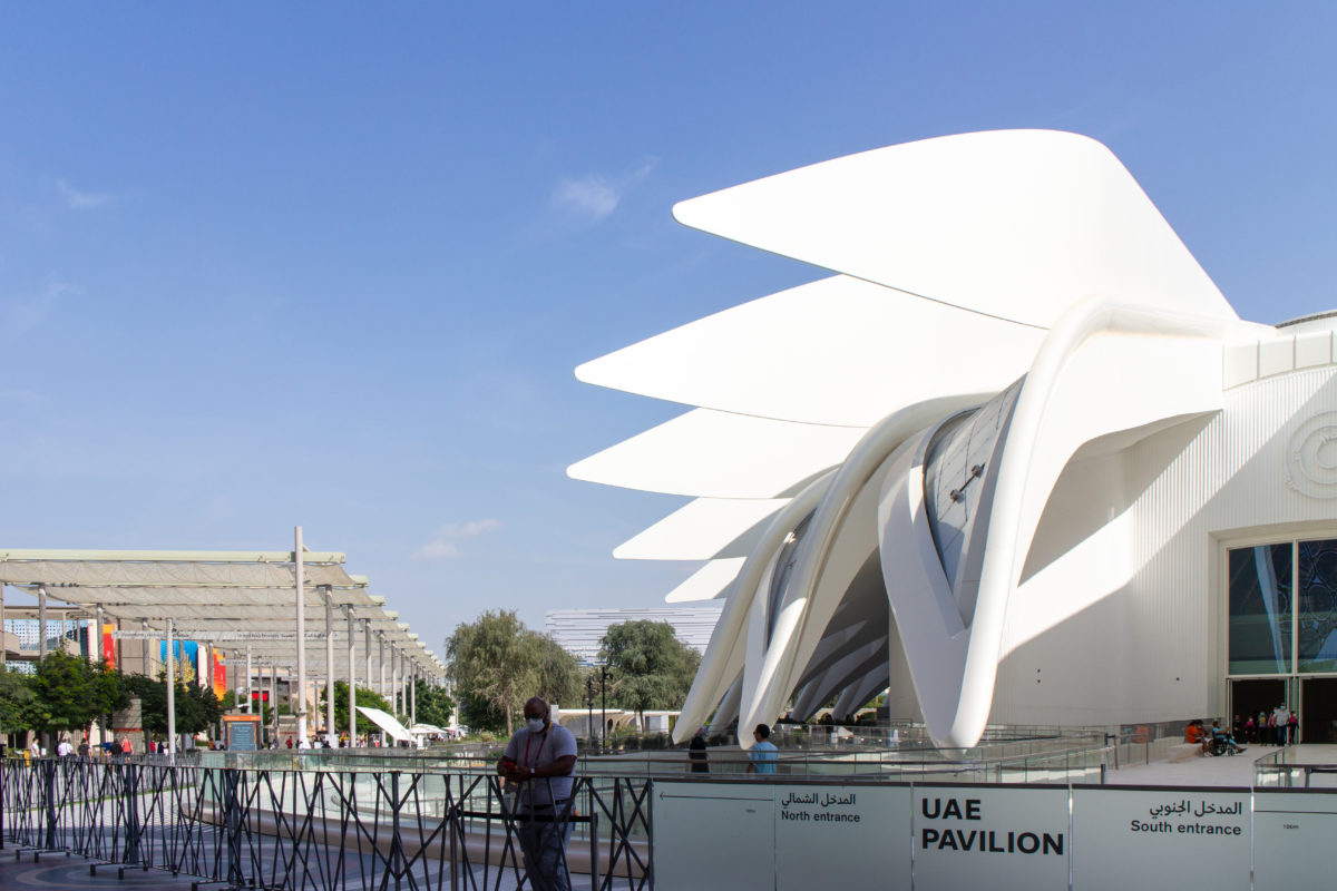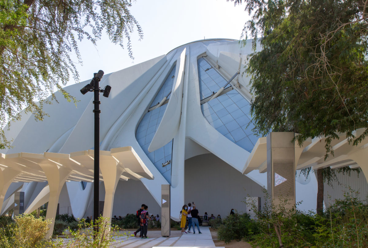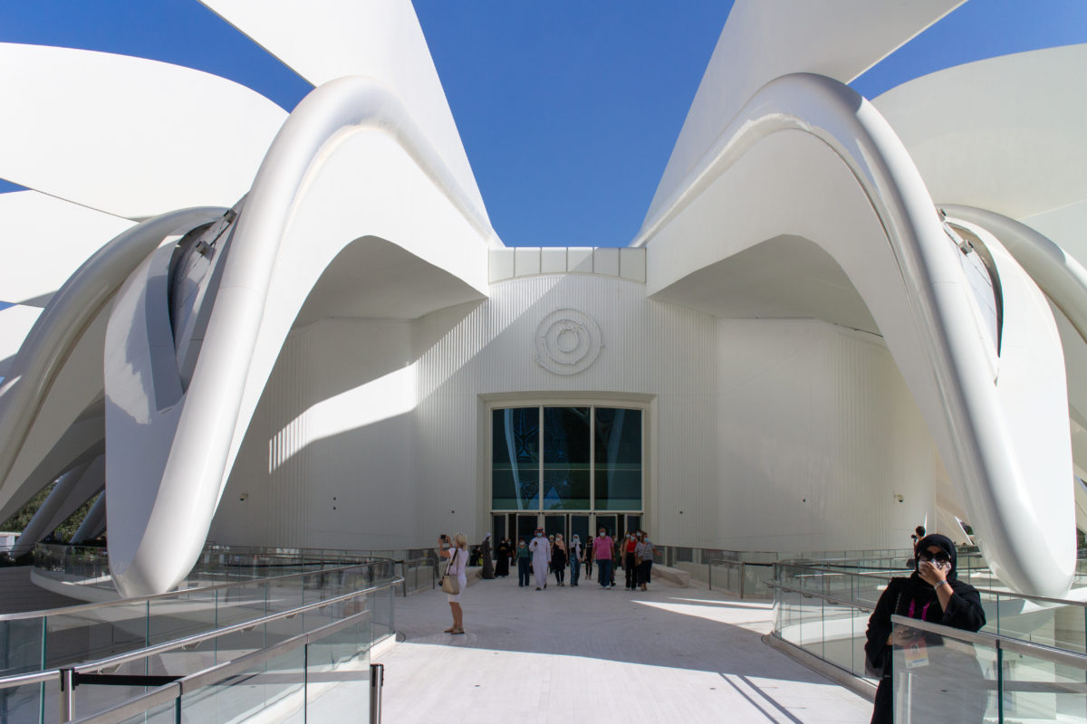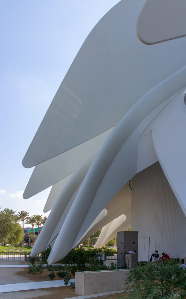 スペイン人建築家のデザインは、建築物から周囲の景観に至るまで、開催国を代表するものだ。 このプロジェクトは、アラブ首長国連邦の歴史、文化、革新性を来館者に紹介することを目的としている。 この国家的モニュメントは、建築的にも、統合された映画的機能を通じても、訪問者に没入的で多感覚的な体験をもたらし、エミレーツの歴史、文化、未来的革新を紹介するように構成されている。