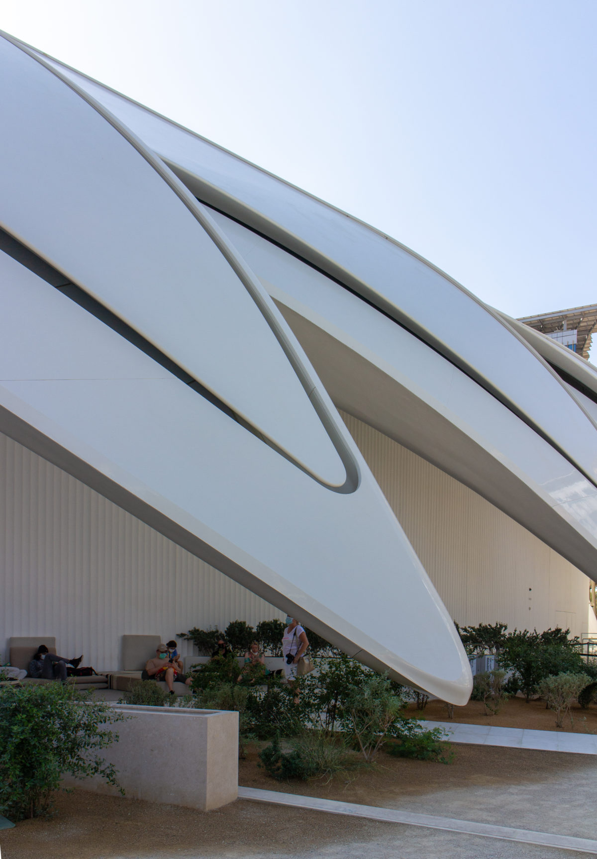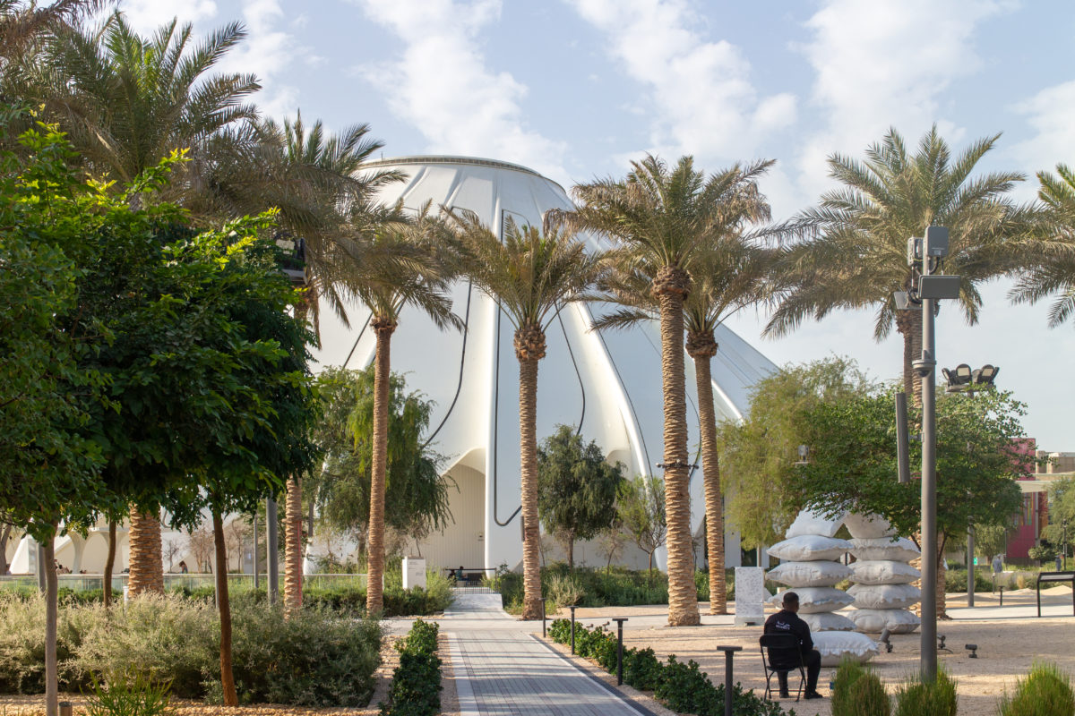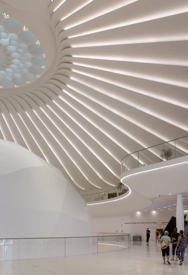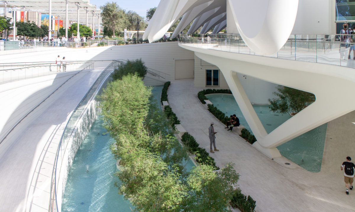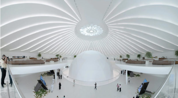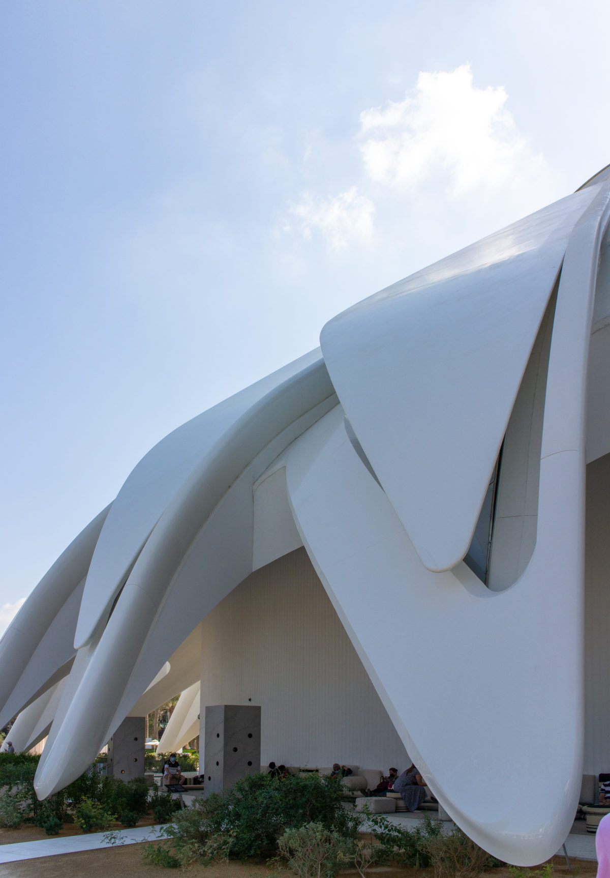 スペイン人建築家のデザインは、建築物から周囲の景観に至るまで、開催国を代表するものだ。 このプロジェクトは、アラブ首長国連邦の歴史、文化、革新性を来館者に紹介することを目的としている。 この国家的モニュメントは、建築的にも、統合された映画的機能を通じても、訪問者に没入的で多感覚的な体験をもたらし、エミレーツの歴史、文化、未来的革新を紹介するように構成されている。