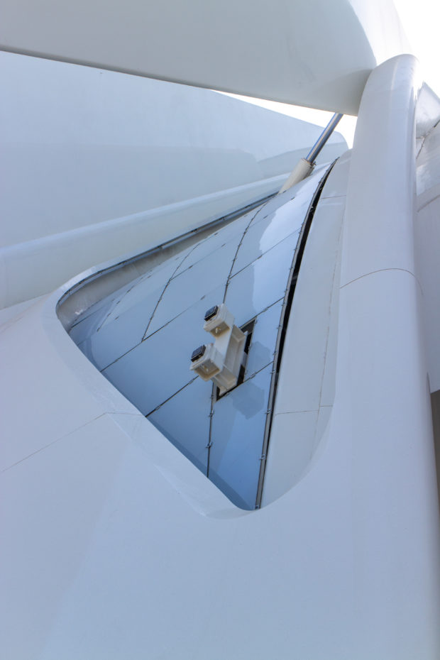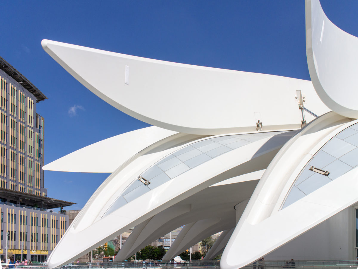 4階建ての建物の上部には、28枚の可動式カーボンファイバー製「ウィング」があり、屋根のソーラーパネルを保護するために閉じたり、統合された太陽光発電パネルを通してエネルギーを集めるために伸びたりする。 この翼を開くと、飛び立つハヤブサの翼を連想させる。