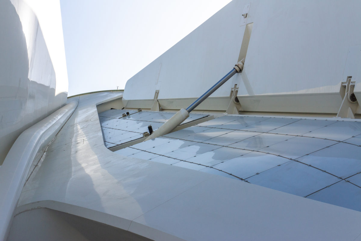 ハヤブサの翼に見立てたカーボンファイバー製の開閉式フラップは、油圧式で動かすことができ、太陽光をより多く採り入れることができる。 エミレーツで製造された太陽電池は、外部ファサードに張り出したウイングのデザインに組み込まれており、垂直の壁だけでなく、その周囲の公共回遊路にも影を落とす。 各翼は1点を中心に回転し、屋根全体を3分で開くことができる。 ピストンとして働く46個の油圧機構により、翼は110度から125度の範囲をカバーできる。 作動すると、油圧オイルがこれらのアクチュエーターを通って押し出され、ピストンを伸ばして翼を最大能力まで開く。 翼を閉じれば、雨や砂嵐からプレートを守ることもできる。