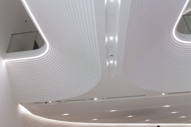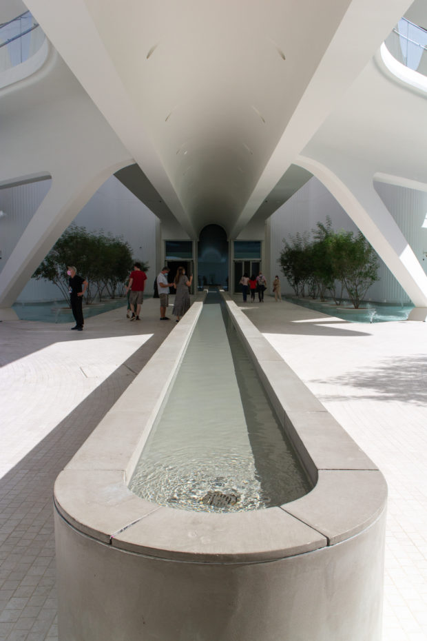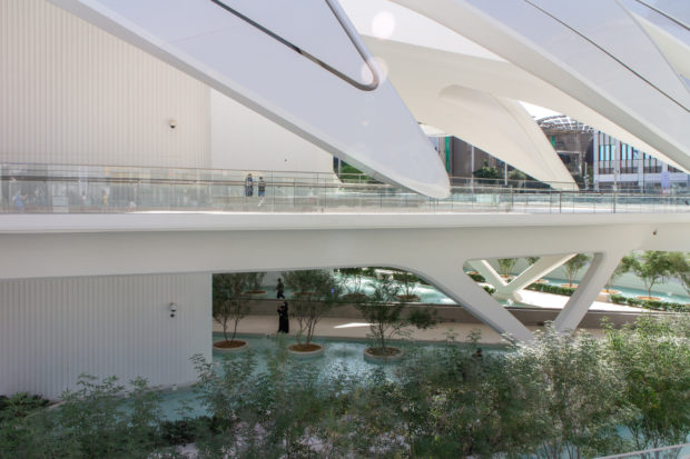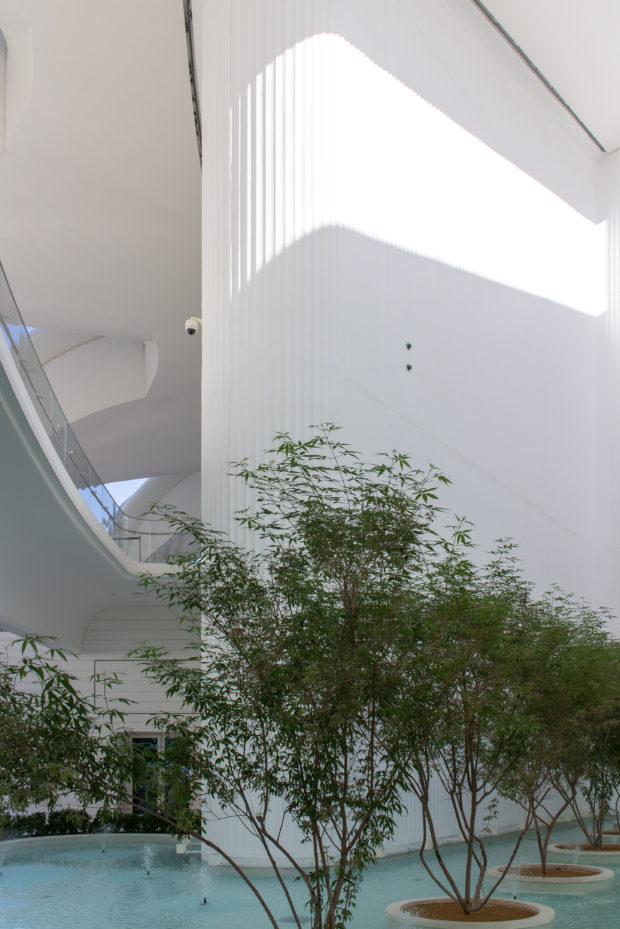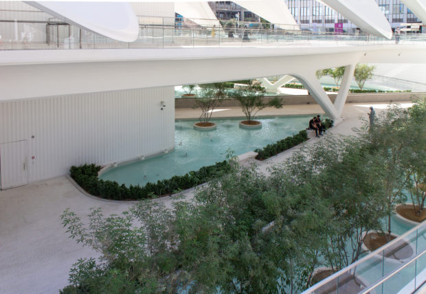 カラトラバは、ダイナミックな空間を作り出すだけでなく、エネルギー効率を高め、水の消費量を減らし、室内の空気の質を最適化する要素を取り入れることで、持続可能性を優先させた。