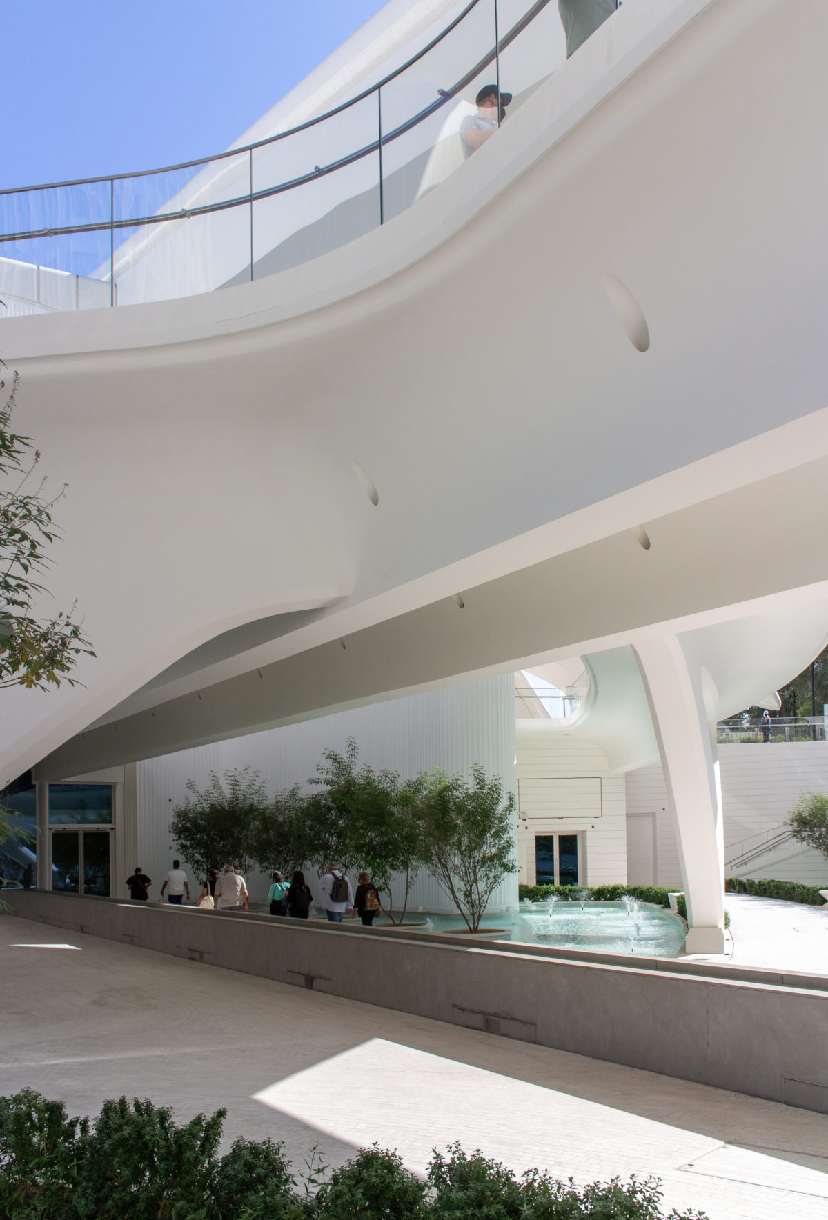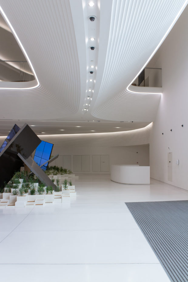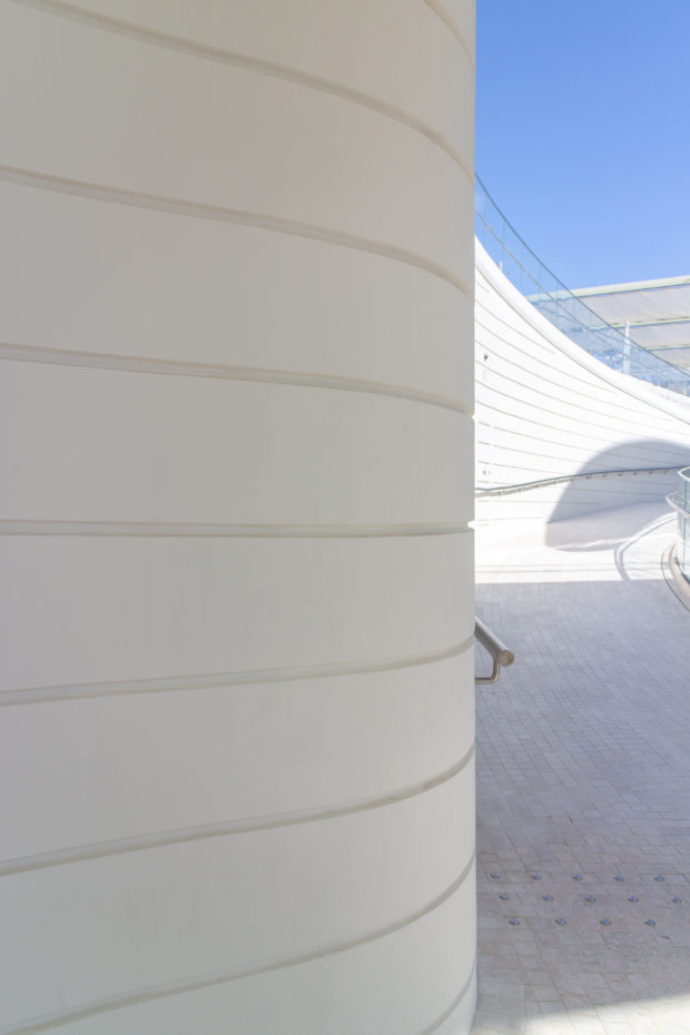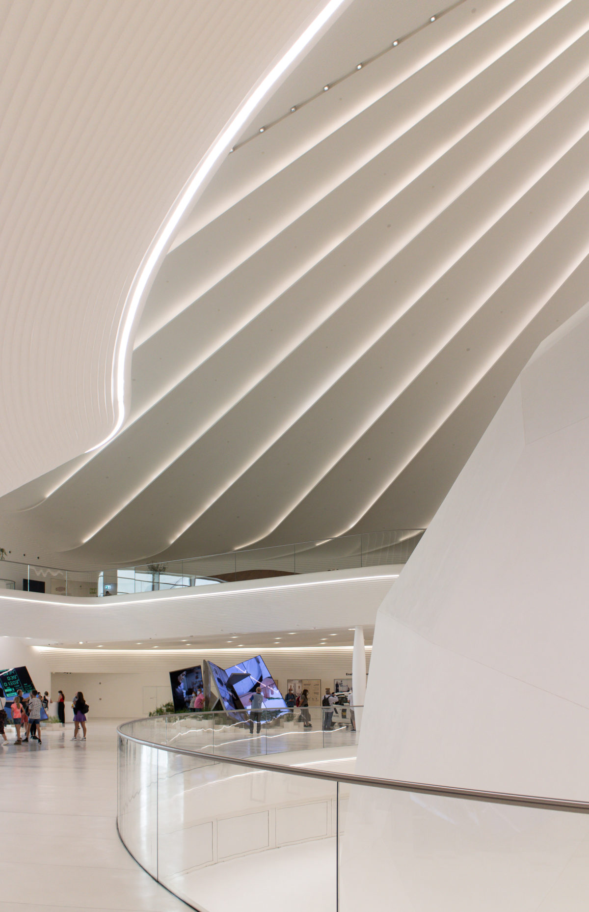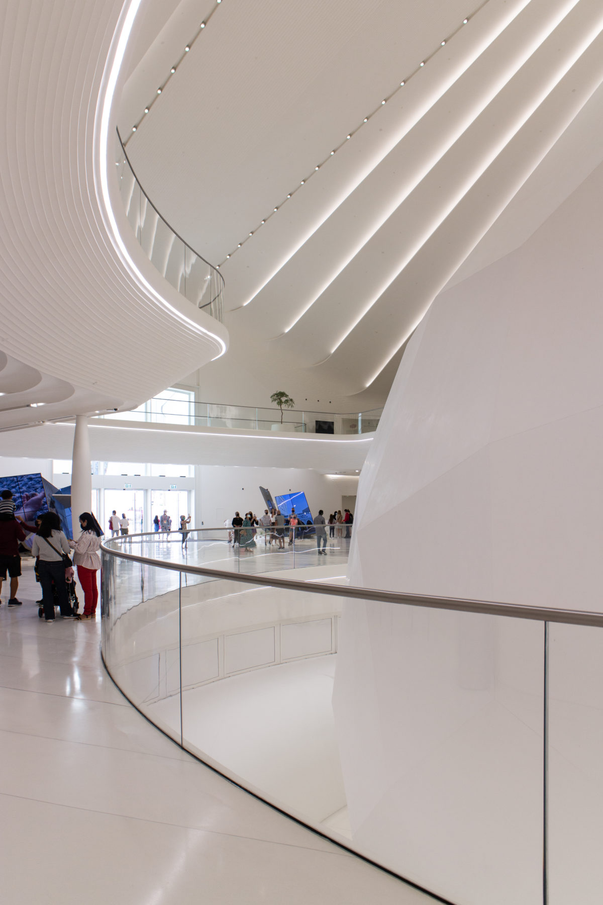 移動の流れ、シンクロナイズド・フロー、技術革新を象徴的に解釈し、モビリティの力をチャネリングすることで、建築空間と構造システムの関係が融合し、空間全体を2020年万博のメインテーマにつなげるつながりを生み出している。