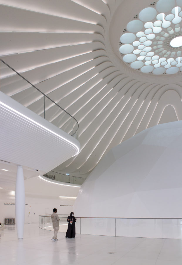 建物の中央には、大きな切子細工の球体がある空洞があり、最大200人を収容できる講堂となっている。 このヴォイドは、万博のロゴが入った円形の天窓「オキュラス」で屋根が仕上げられ、自然光が入るようになっている。 その周囲には、ミーティングスペースや、この国の過去、現在、未来を紹介する没入型の展示ホールがある。